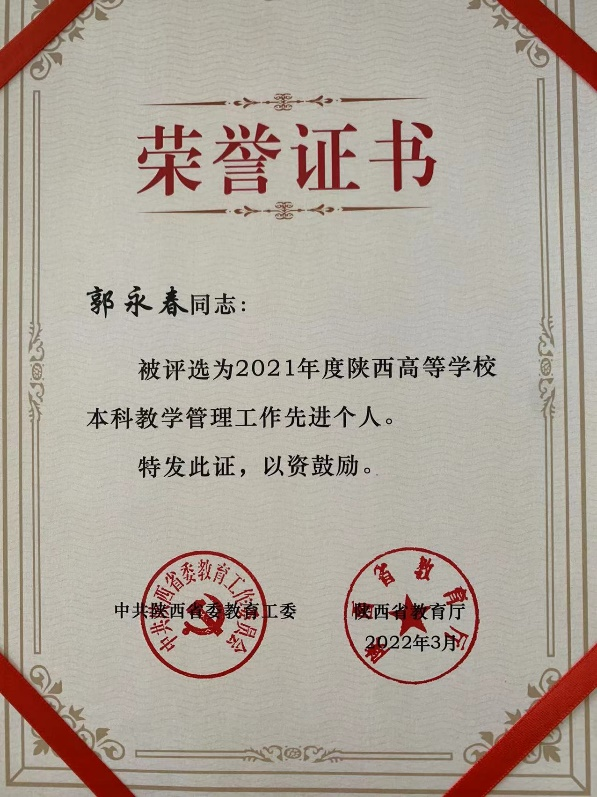 成人游戏 郭永春同志被陕西省委教育工委评选为2021年度陕西高等学校本科教学管理工作先进个人。表彰他在2021年度的工作表现。