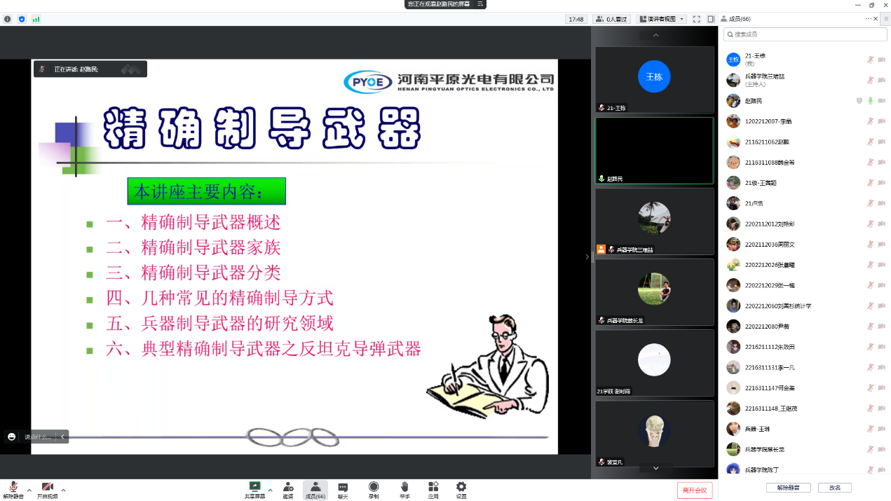 作题为“精确制导武器系统”的线上讲座。本次讲座由教学院长蔡长龙主持,院长郭永春、学院教师及全体研究生参加讲座。