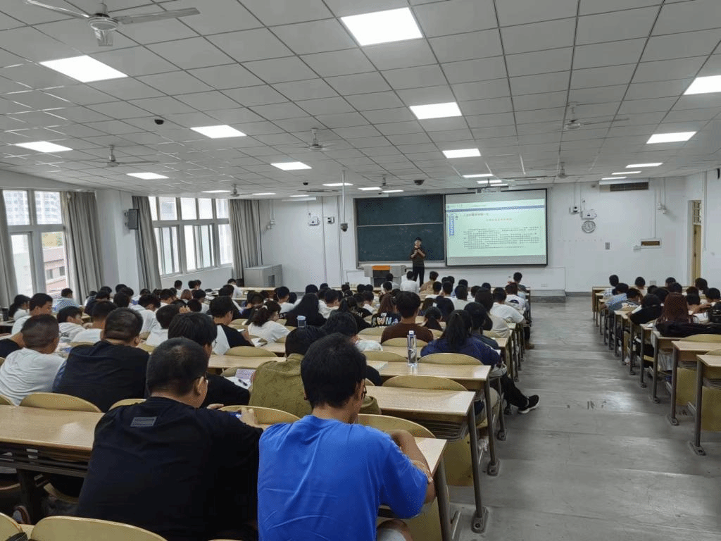 辅导员王国栋在教1-302为人工智能、探测制导与控制技术、武器系统与工程专业170余名新生进行大学生职业生涯规划指导。