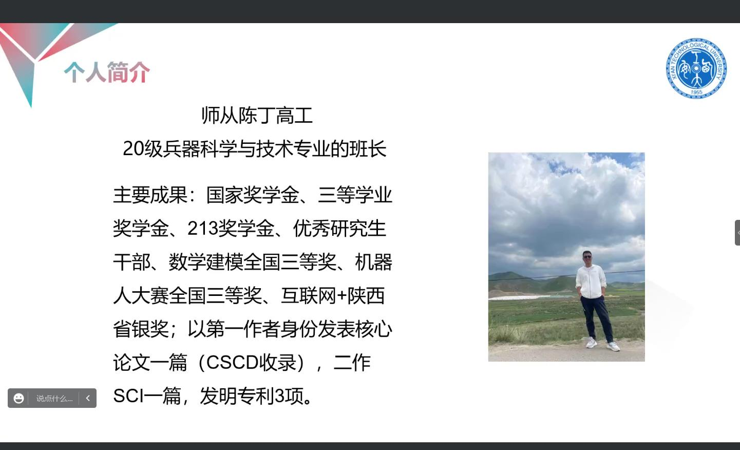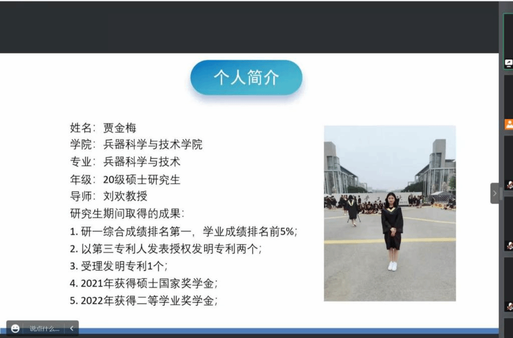 于2022年9月23日19:00在线上举办了“国家奖学金”获得者交流报告会,参会人员有研究生辅导员王国栋、2022级全体研究生、国家奖学金获得者贾金梅、牧迪和雷晓明。