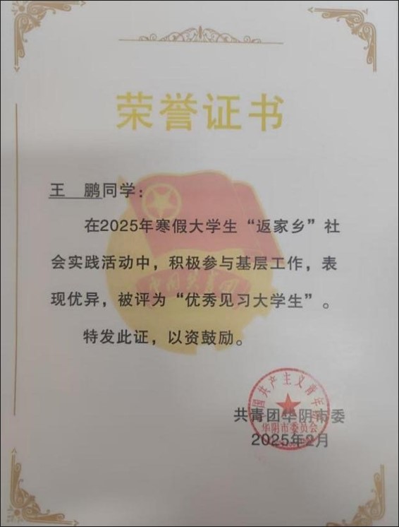 23级武器系统与工程专业本科生王鹏、张智超积极响应学院以及学校关于“返家乡”社会实践的号召,分别在华阴市罗敷镇政府与华阴市委统战部实习工作。
